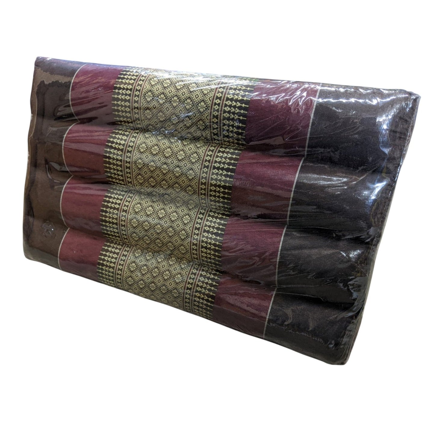 Enhance your meditation practice with the remarkable Kapok Filled Triangle Pillow from Thailand, a handcrafted treasure from Thailand’s vibrant artisan heritage. Triangle Pillow: Cotton outer with Natural Fiber and Kapok Fill (12" x 12" x 19"). Thai pillows boast a rich history that dates back to the Sukhothai era in the mid-13th century, and likely much earlier. These essential pieces, which include pillows, mattresses, and mats, are crafted from high-quality fabric, kapok filling, and rice straw for their distinctive triangle designs. These materials have long been a staple of Siamese culture, ensuring both comfort and tradition endure. This exquisite pillow, featuring a warm brown, purple, and white palette, showcases the skilled craftsmanship of Thai artisans. It is perfect for creating a serene meditation or lounging space, or as a thoughtful gift, embodying the cultural richness of Thai and Lao traditions.